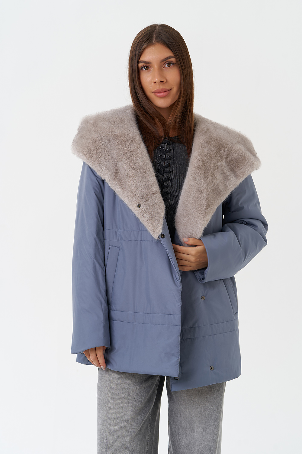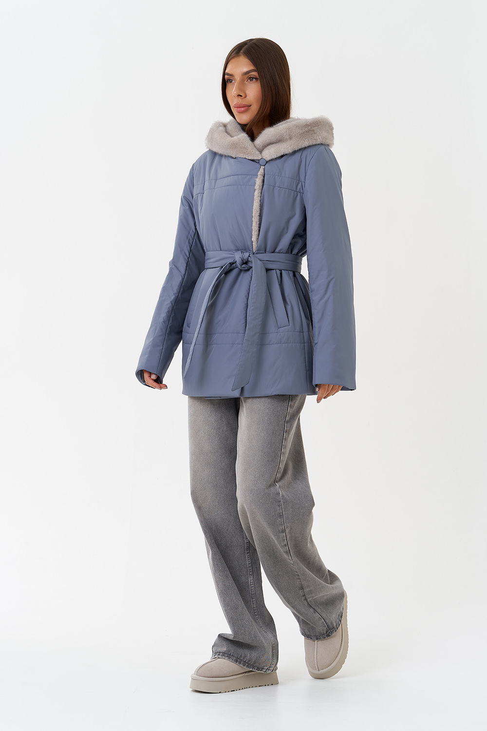 Крой воротника - капюшон, отделка эко мех под норку