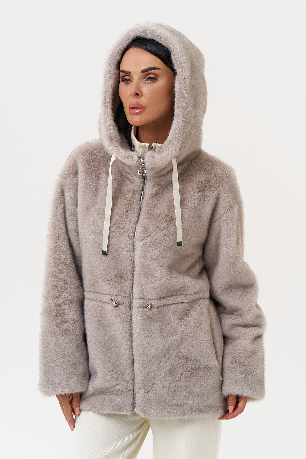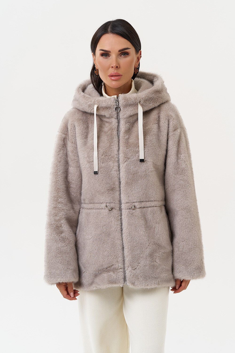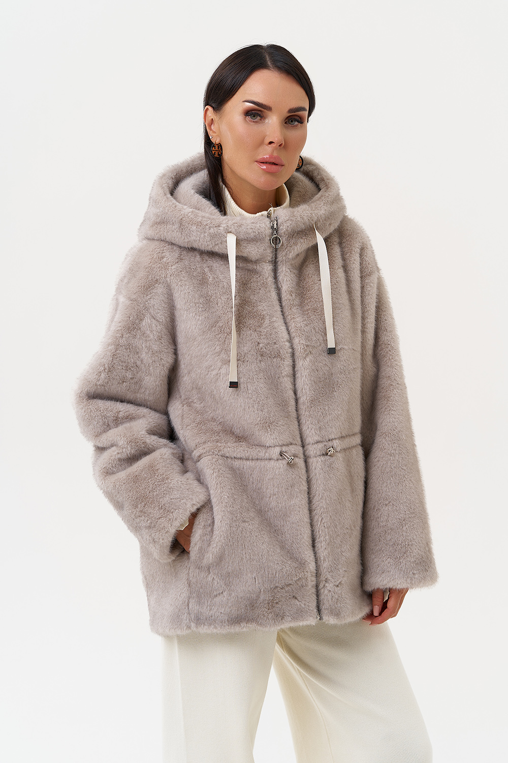 Фасон - прямой Длина изделия - 70 см Цвет - серый Материал - экомех Состав полотна - полиэстер 100% Подкладка - полиэстер 100% Вид застежки - молния, кулиска на талии Вид ворота - капюшон Фасон рукава - спущенное плечо, длинный |