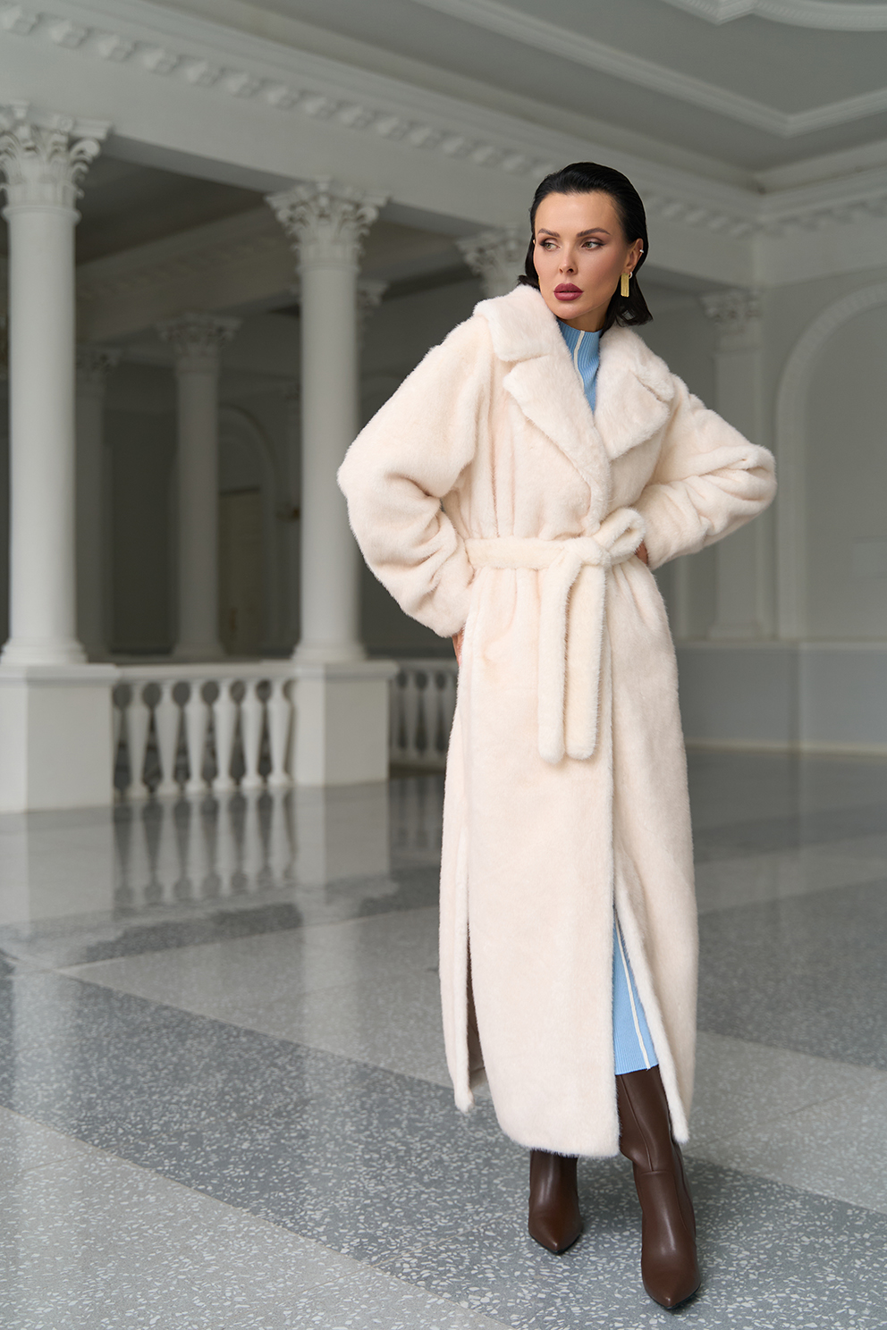 Фасон - прямой Длина изделия - 130 см Цвет - светло-бежевый (молочный) Материал - экомех Состав полотна - полиэстер 100% Подкладка - полиэстер 100% Вид застежки -крючки, пояс Вид ворота - английский воротник Фасон рукава - втачной, длинный |